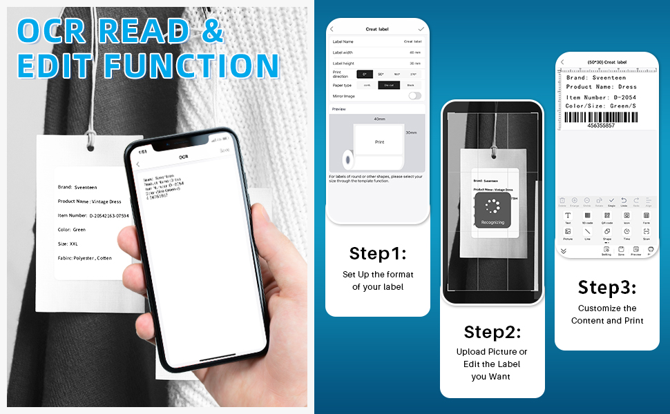 | ●​[Powerful & Flexible App] Phomemo M120 label maker APP "Printer Master" have powerful voice recognition and image recognition technology to improve work efficiency. And "Printer Master" APP also have OCR-Optical character recognition, recognize text on images in 4 seconds. "Printer Master" APP comes equipped with a broad range of label customization options, including 9 font sizes, 128 templates, 354 Symbols. Supporting excel batch printing and print retail labels, cable labels, drug labels etc.​ |