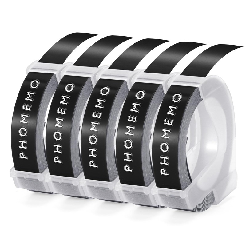 Phomemo Label Tape Embossing Tape Compatible with Dymo Omega Label Tape Replacement for Dymo 3D Label Tape 9 mm for Dymo Omega S0717930 Junior S0717900 Labelling Device (White on Black, Pack of 5)