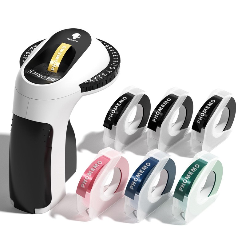 Phomemo Labelling Machine, 3D Embossing Machine E975, Portable Labelling Device, Black Label Embossing Device with 6 Label Tape, Ergonomic Design, for Home