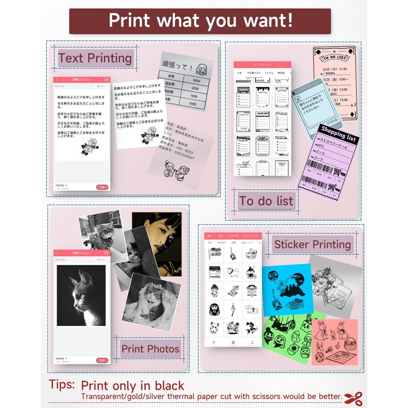 - Powerful Phomemo App: This thermal photo printer support printing classical black and white photos, work or learning notes, forms, memo, web pages, text and more. Better improve learning and work efficiency. A variety of free template materials for you to choose. It can also print a variety of patterns for painting, graffiti. It is a good assistant to improve your children's creativity and hands-on ability.