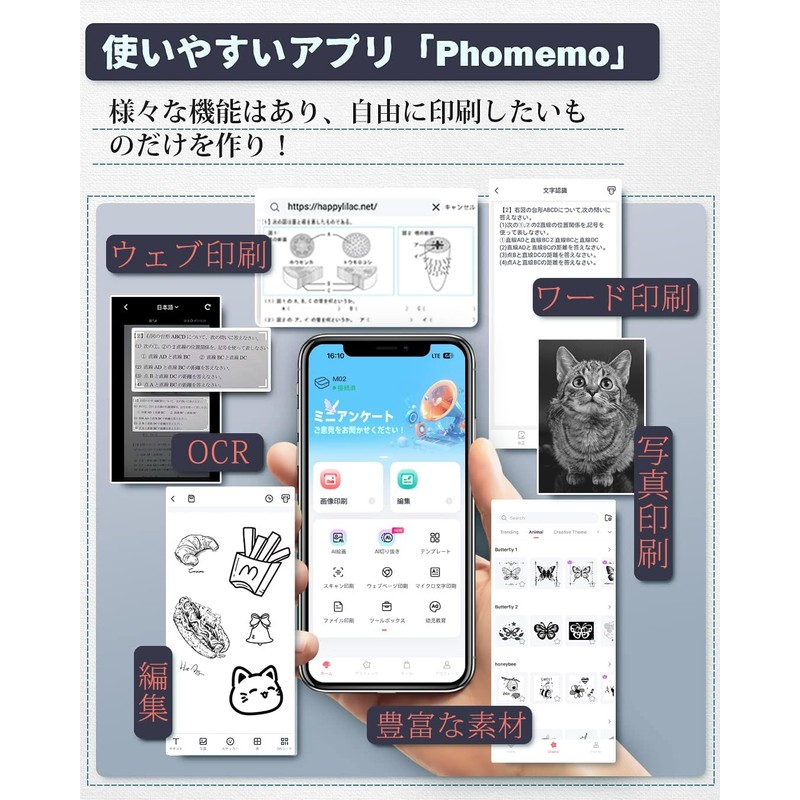 • The Phomemo M02 is a portable mini printer.Connect it to the Phomemo app on your phone using Bluetooth.Packed full of easy-to-use features that allow you to print cute stickers, vintage photos, memos, and labels for organizing your stuff.