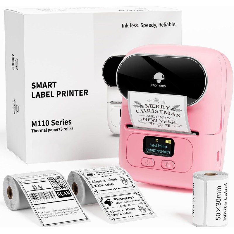 Phomemo M110 Bluetooth Label Printer, Portable Labelling Device Label Printer with 3 Label Rolls, for Barcodes, Retail, Office and Small Businesses, for Android and iOS, Pink