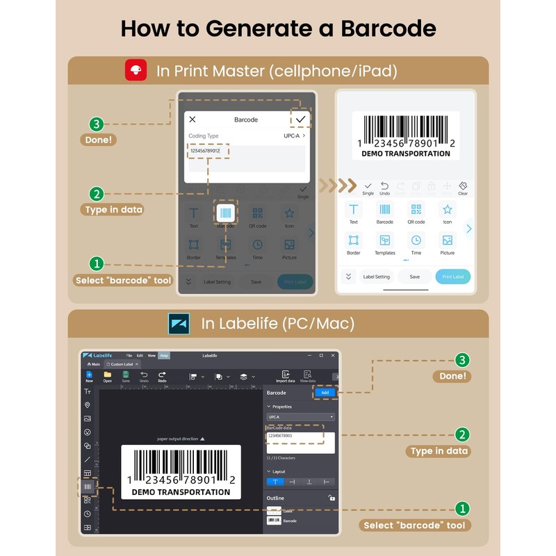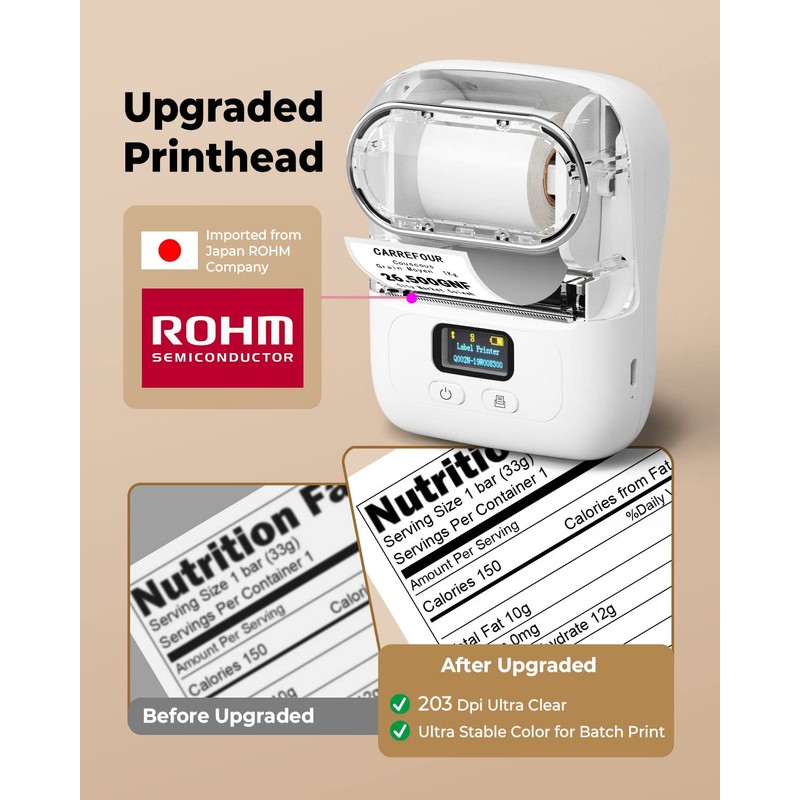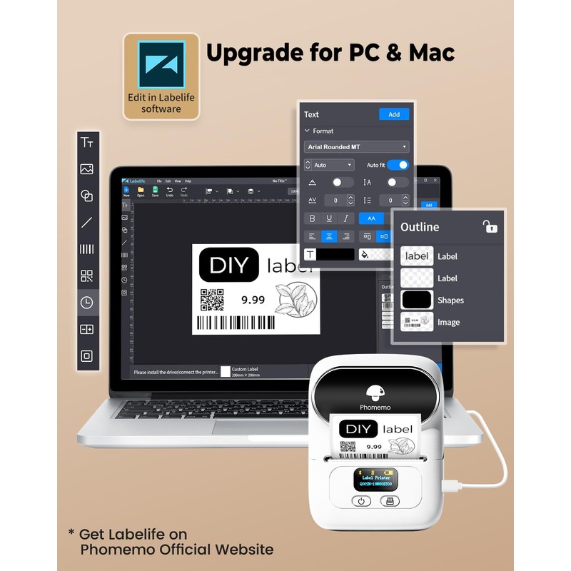 - 【Capable to Print Anything on Labels】This portable label maker can print labels in WIDTH of ¾'' to 1⅞'' (20mm-50mm), maximum LENGTH of 3⅛''(80mm): text, picture, QR code, barcode label, product label, address label, ingredient label, price label, clothing label, jewelry label, etc.Phomemo Label Printer supports batch printing.