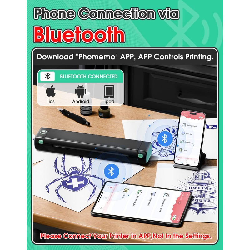 • Tattoo Printer Machine with Powerful APP - Say goodbye to complicated printing processes. The Phomemo App allows for one-click printing of images and documents. In addition, it offers a convenient scanning function specifically designed for tattoo designs. Unlike traditional tattoo printer machine that require printing on white paper before copying, you can print your designs instantly with our app. For better quality tattoos we recommend using phomemo tattoo transfer paper