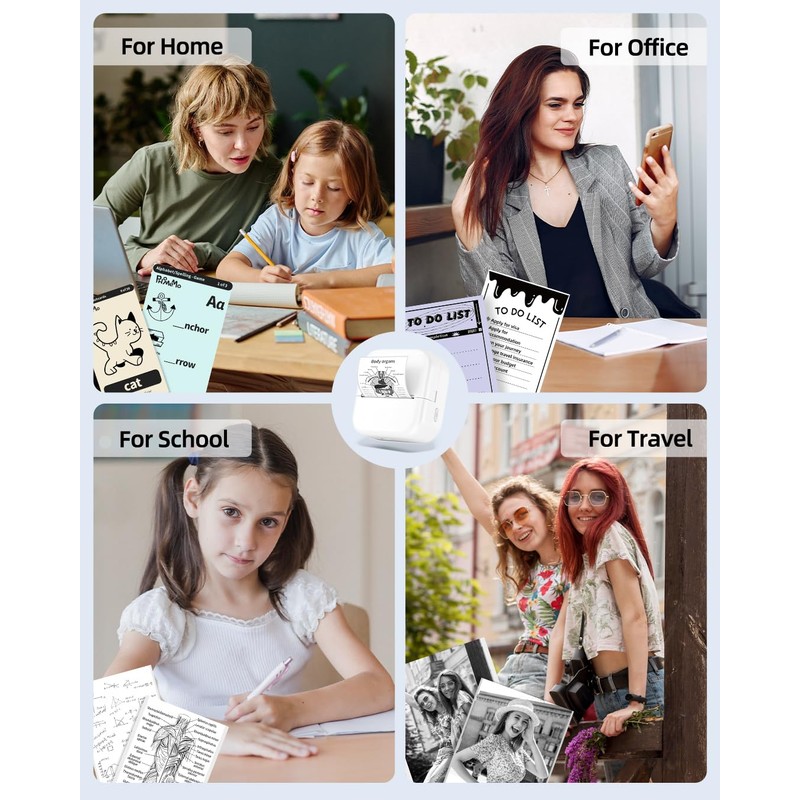 - MULTIFUNCTIONAL MINI THERMAL PRINTER This compact mobile printer not only supports printing photos from your phone, but also allows you to print your favorite texts, illustrations, labels and more. This will make your school notes more refined and appealing, and your household lists more clearly and aesthetically pleasing. The mini Bluetooth printer is versatile, such as office, home, DIY projects and learning environments