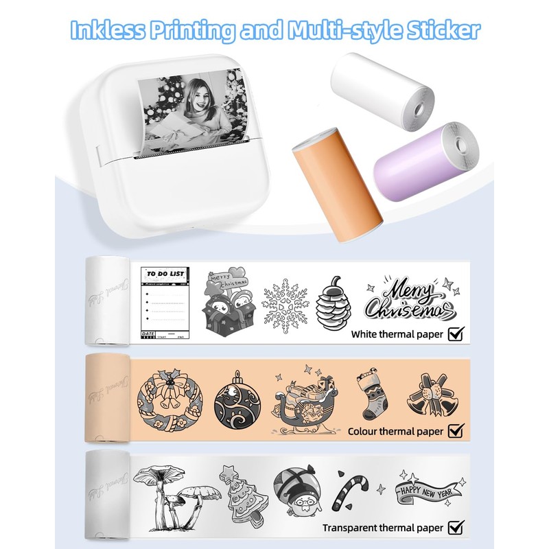 - Black white mini photo printer: mini inkless thermal printer that allows you to print black and white photos anytime and anywhere by using the sticker maker to print your photos and pictures. The M02X sticker machine is not only suitable for self-adhesive or non-self-adhesive white thermal paper, but also for coloured and clear transparent sticker printer paper, which offers you a variety of printing options