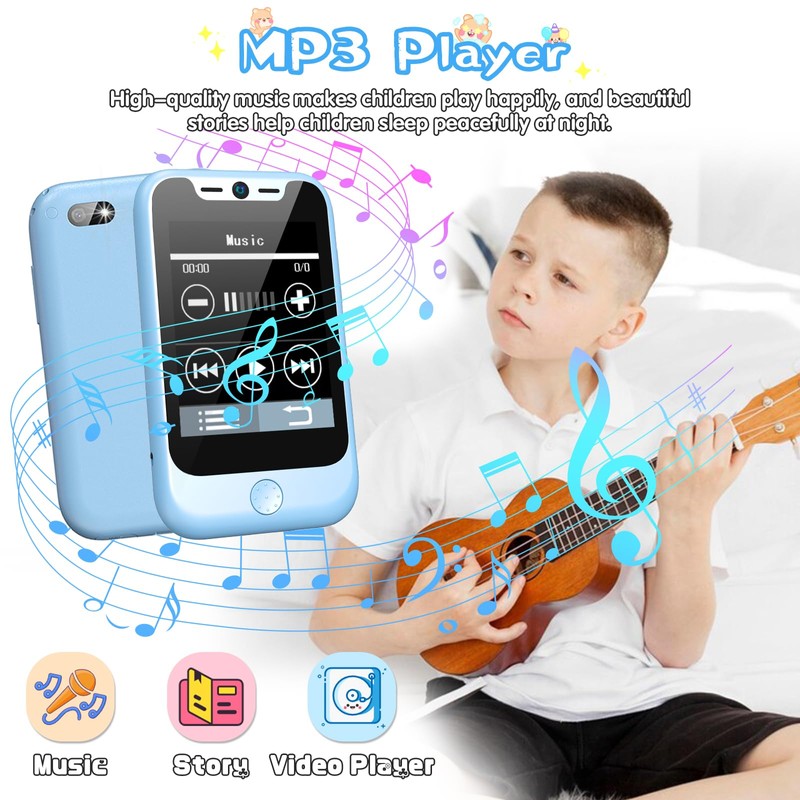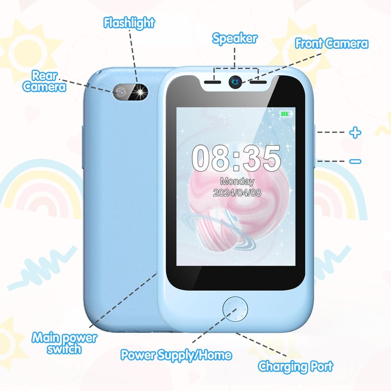 - 【Multifunctional Kids Phone】Features: Music playback, story reading, front and back cameras, audio recording, pedometer, stopwatch, learning cards, timed alarm clock, and 16 puzzle games.Additional Features: HD touchscreen with smooth touch feel, portable hanging port for easy carrying, large storage for up to 1,000 photos, and USB Type-C charging cable.