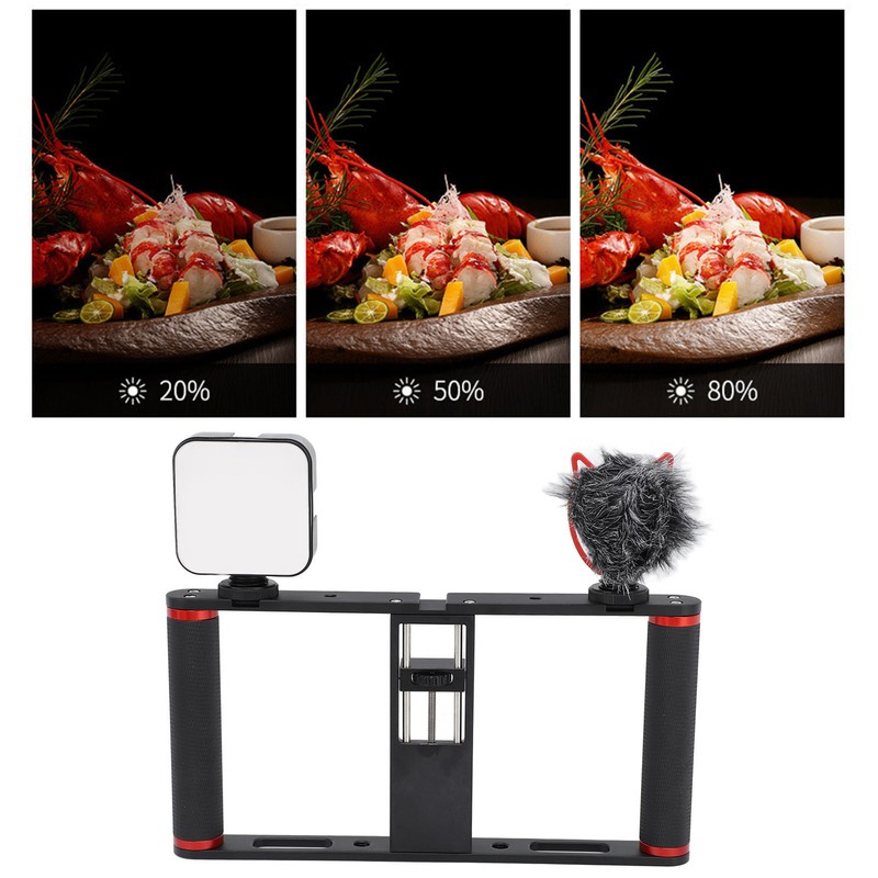 1、Adjustable and Expandable: Equipped with springs and cushion, phone clamp is fit for different phone sizes and will not scratch the phone. With multiple cold shoe interfaces and 1/4 thread interfaces, various peripherals can be installed. 2、Aluminum Alloy: Phone rig is made of aviation grade aluminum alloy, provide a more stable support for phone, rugged, corrosion resistant, ergonomically designed that makes it comfortable to hold. 3、Bright Fill Light: The set includes fill light, containing 49 high brightness LED lamp beads, soft light, good color rendering. Small size, light weight, universal interface, easy to install and carry. 4、Premium Microphone: All metal CNC manufacturing, with good shielding performance, no interference from the surrounding, the sound pickup area is concentrated in front of the microphone. 5、Noise Reduction: Equipped with mircophone foam cover, strong anti interference, can effectively filter the noisy noise around, 10M maximum receiving range, outdoor can also be used. 6、Multipurpose: This set of equipment can simultaneously handle live recording, online teaching, video light recording, media interviews, live sales, outdoor photographing.