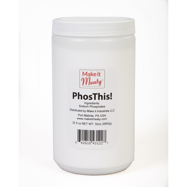Also known as AmesPhos, marinate, soak or inject a 1-2% PhosThis! solution into sausage, meat, fish, poultry or seafood to retain natural juices and increase yield. Improves texture for fuller, juicier finished product. 16 ounce package (net weight) makes about 85 pints of injectable marinade, while 50g (1.76oz net wt) is a sample size.