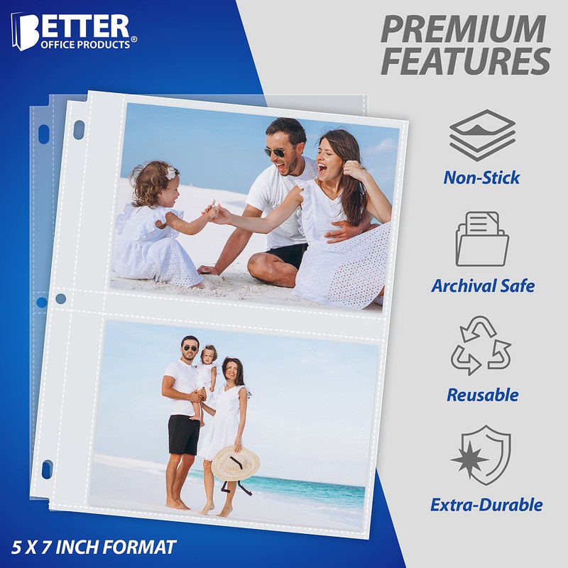 Photo Album Refill Sheets, 5 x 7 Inch, Heavyweight, Diamond Clear 3 Ring Photo Binder Page Refills, by Better Office Products, 400 Total Photos, Each 2-Pocket Sheet Holds Up to 4 Photos (100 Pack)