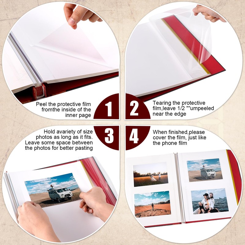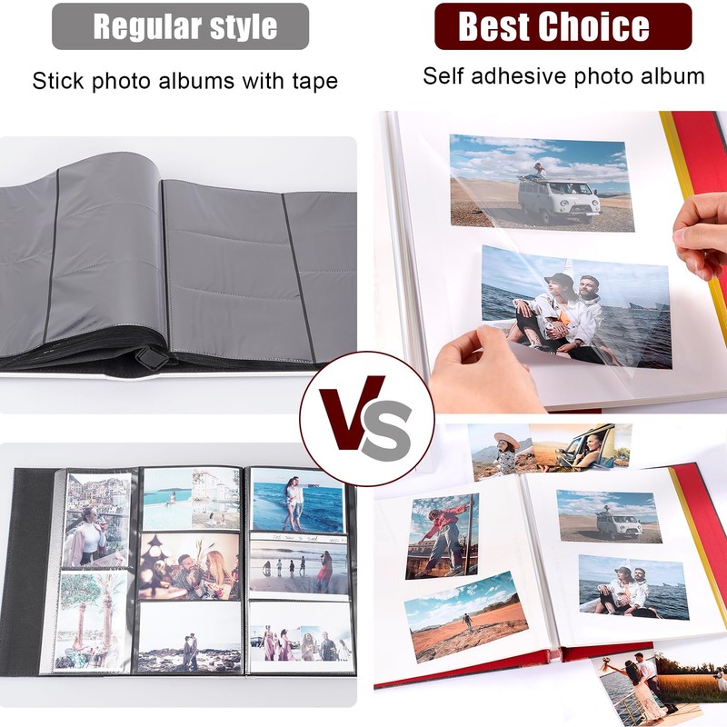 - Easy to Use:Self adhesive photo album for all size pictures,Can hold all size photos of 5" x 3", 6 "x 4", 8" x 6" and 10" x 8"Simply tear off the cling film and paste your photos onto the adhesive pages,making it a hassle-free process.