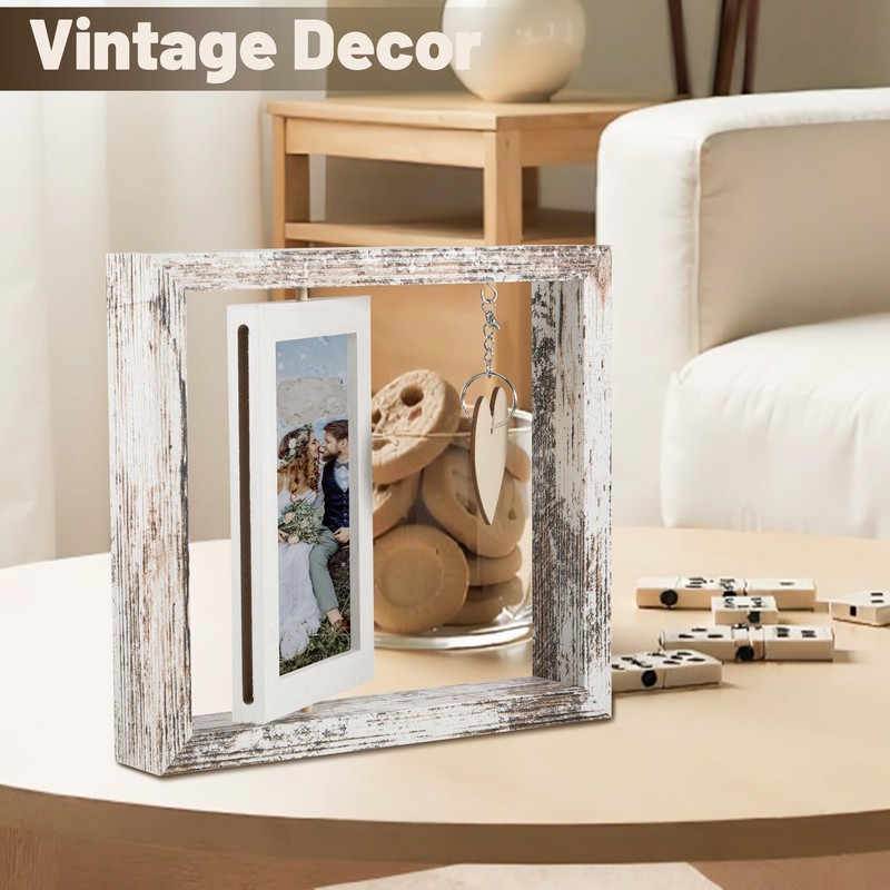 Photo Frame 4x6, Rotating Floating Wooden Picture Frames with Heart Pendant Double-Sided Square Spinning Display for Tabletop Standing Decor, Gifts for Wedding Family Best Friends, Mothers Day Gift
