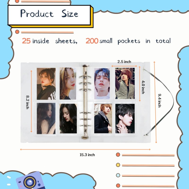 - 🌟【Large Capacity & Safe Storage】: Containing 25 pcs inner pages (Each pages with 8 pockets, totally 200 pockets), can hold 200 sheets of 2.5 x 4 inch kpop photos in total. The size of the kpop photocard album is 7.16 x 9.52 x 1.18 inches, the each inner pocket page size is 4 x 2.55 inches. There is an elastic cord on the side of the binder cover, which can be sealed to save your album and keep cards from falling.