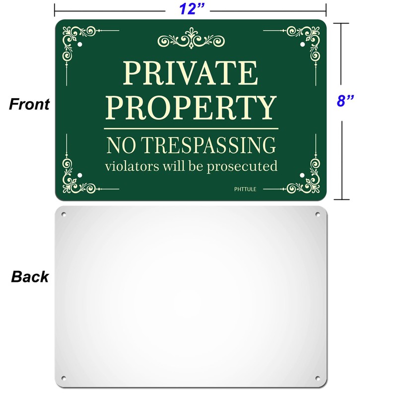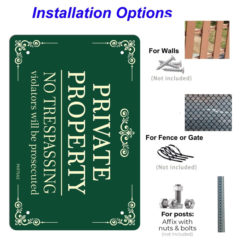 - Easy to install: This no trespass sign has 4 pre-drilled holes and can be easily mounted on any surface including walls, fence,poles and gates; with screws, nails, tie-wraps. Sign attachment accessories are not included.