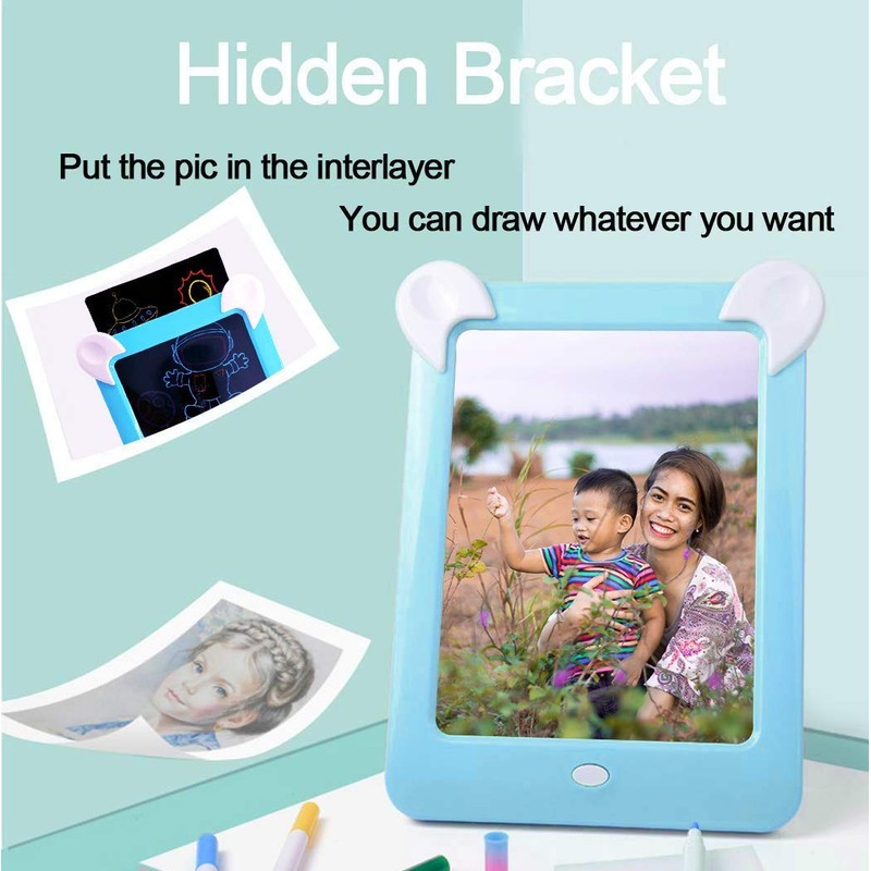 - REUSABLE AND DUAL USE MAGIC BOARD -- Our magic drawing board both as a toys board, but also as a decorative photo frame. There will be different colors of light on the drawing tablet, which makes the graffiti more vivid and interesting. Each time you press the button, you change the color of the light. And just wipe clean when you need drawing and writing again ,it is safe and fun for kids.