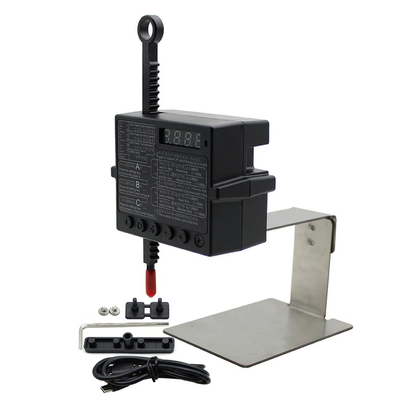 - [Product Functions]----ABC configurable content:(1).click head travel distance.(2).press the start key to click the head's click direction.(3).Delay stop running.(4).The number of clicks performed by the end of the timer.(5).click head running speed.It can Continuous click up to 6 times in 1 second.It has two time dimensions waiting for clicks and keep pressing,It enables arbitrary combination of Fixed time and Random time for 0.1-999S.