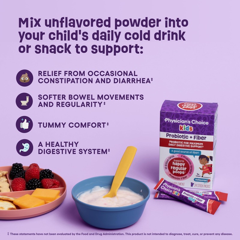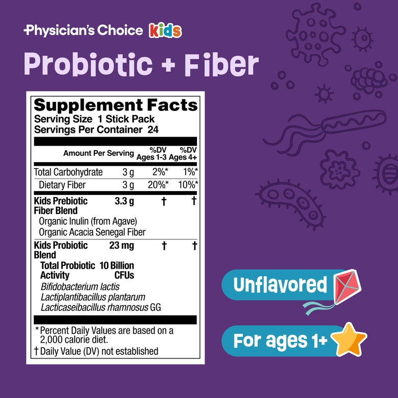 Physician's Choice Kids Probiotic + Prebiotic Fiber Packets (Ages 1+) - Supports Regularity, Occasional Constipation & A Healthy Digestive System - No Allergens or Preservatives - Unflavored - 24 Pack