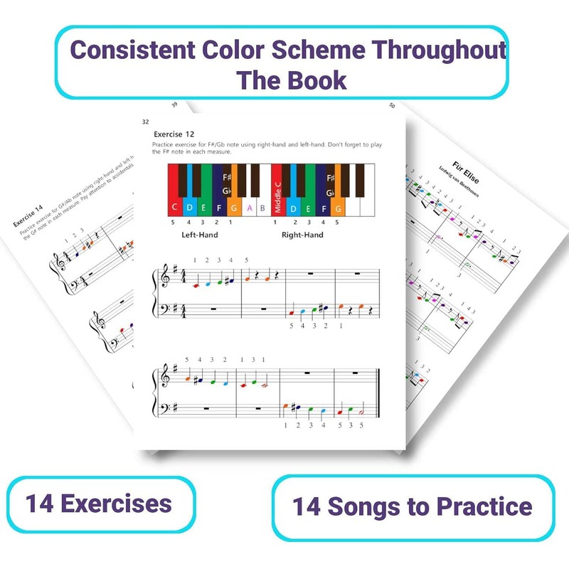- ⦗ COLOR CODED NOTES ⦘ Notes in the lesson book are color coded using bright and cheerful colors. It helps kids and beginners to identify and memorize notes quickly and easily. A game changer for visual learners and those who are just starting out, regardless of their age. 🏆