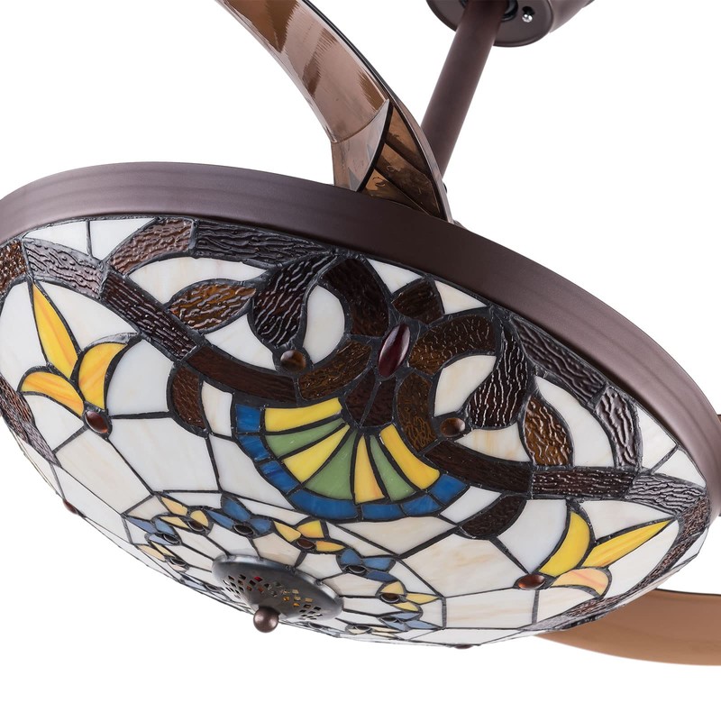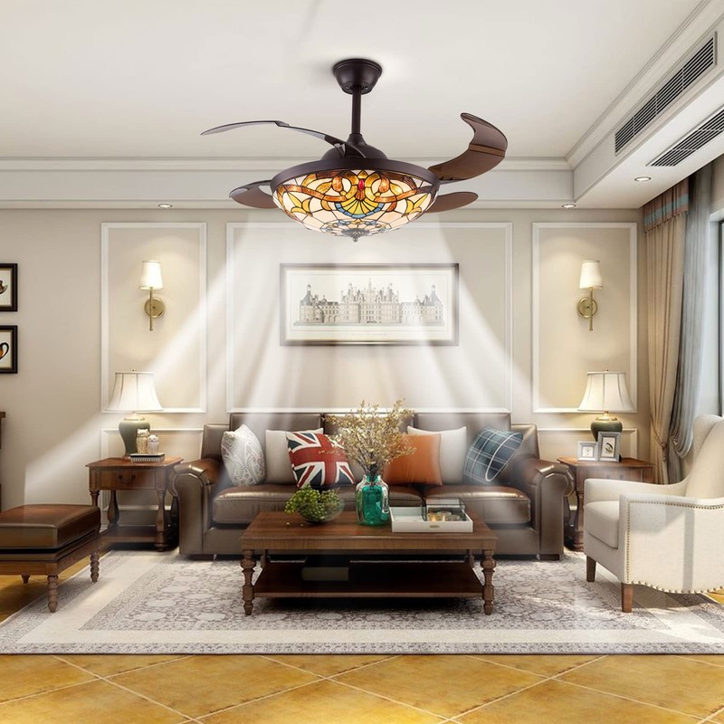 PIAOCAIYIN 42" Invisible Ceiling Fan, Retro Stained Glass Ceiling Fan, Retractable Ceiling Fan w/Lights & Remote, Ceiling Fan w/4 Retractable Blades for Living Bedroom