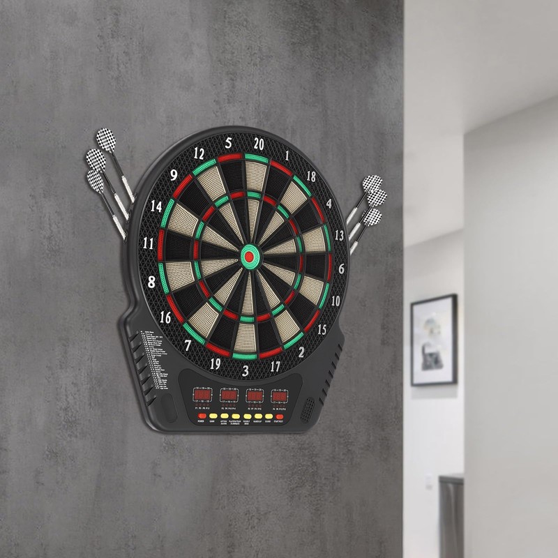 - 【THOUGHTFUL DESIGN】Soft tip iron darts and honeycomb target design provide you with a safe gaming experience. The mesh protective outer ring around the target area protects the darts and walls from damage.The 5.9-foot power cord reduces installation constraints and features energy-saving features.