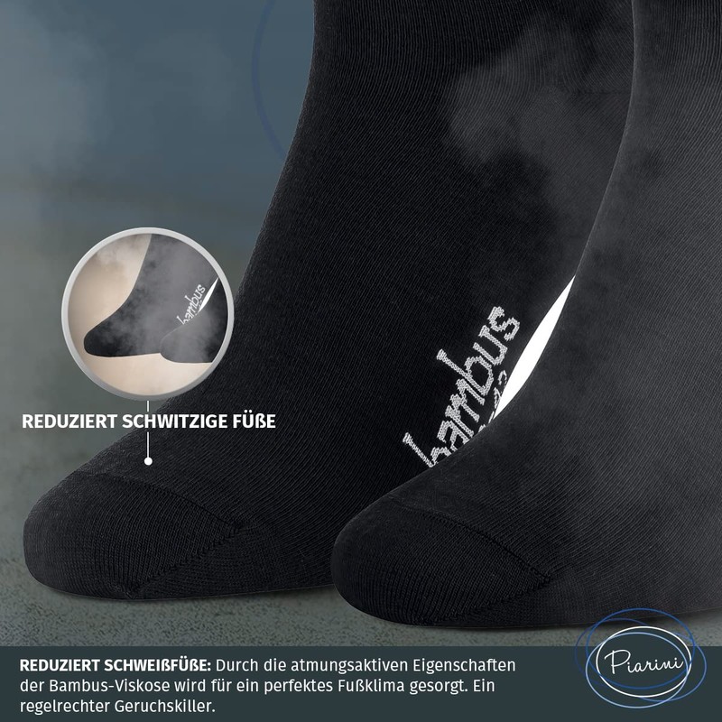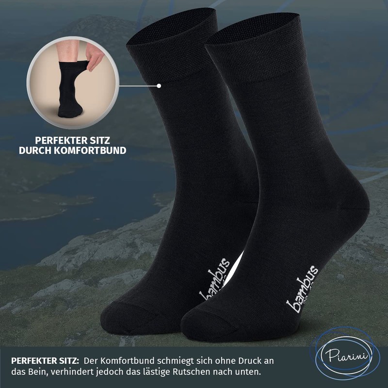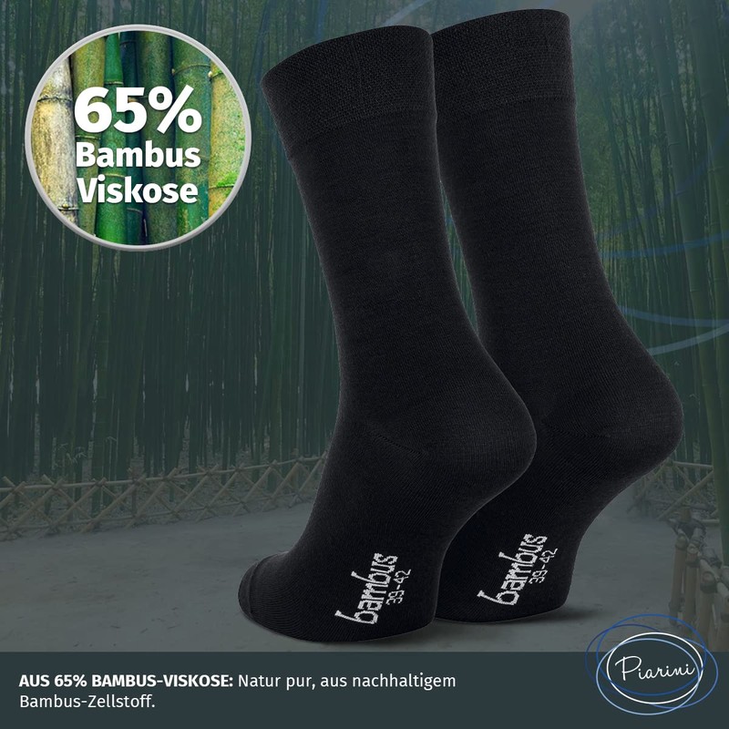 Whether in winter or summer, in the office or in leisure, the bamboo socks from Piarini are a truly ideal and comfortable companion. The viscose used is made of bamboo fibre and ensures a comfortable hold and a pleasant foot climate. Viscose made from bamboo transports moisture optimally and has a breathable and anti-tail foot - even at high temperatures or sports activities. Available in a practical set of 6 in black, anthracite, navy and beige and in sizes 39-42, 43-46 and 47-50 (plus size). The material composition of 65% viscose, 33% polyamide and 2% elastane as well as the practical comfort waistband ensure durability, a good fit and comfortable hold without slipping. The socks are made by modern knitting machines, so optimal workmanship is ensured in terms of material thickness, fit and size.