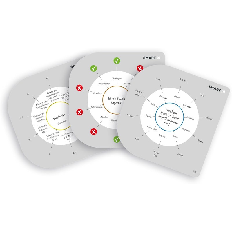 SMART 10 additional questions 2.0 200 new questions... and 2000 new answers for the revolutionary SMART 10 quiz game. Simply replace the card set with the Smartbox of the original game and nothing will get in the way of other exciting quiz evenings.