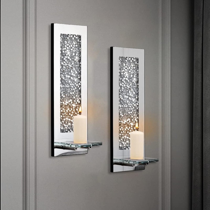 - Material: beveled silver mirror with acrylic crystal crush diamond decoration The Wall Sconce is constructed by MDF wood back for reinforcement and stability.