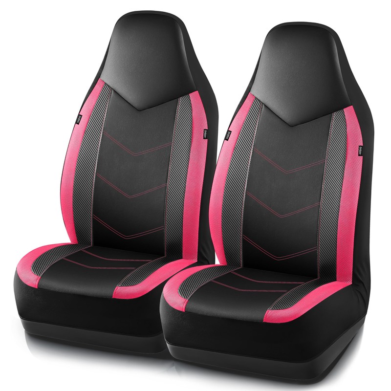 PIC AUTO Leather Car Seat Covers, Sports Carbon Fiber & Mesh Design, High-Back Two Front Set, Waterproof Automotive Seat Covers, Airbag Compatible, Universal Fit for Most Cars (Black & HotPink)
