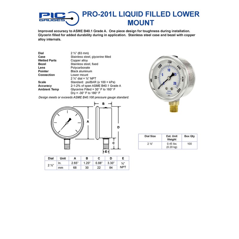 PIC Gauge 201L-254M Glycerin Filled Industrial Bottom Mount Pressure Gauge with Stainless Steel Case, Brass Internals, Plastic Lens, 2-1/2" Dial Size, 1/4" Male NPT Connection Size, 0/1000 psi Range