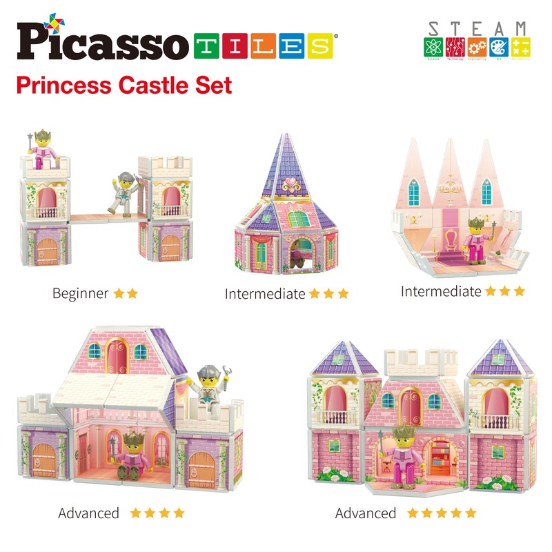 - DREAM BIG & BUILD BIG: Unleash creativity with PicassoTiles' Princess Castle theme Magnetic Building Tile Blocks, featuring 60 pieces that include both exterior and interior printing and 2 magnetized Character Action Figures with omnidirectional arms. Ignite your child's imagination with printed magnet tiles construction toy pretend playset. Construct, imagine and create using your originality and vision! This kit will surely be a favorite for toddlers, teenagers, and adults all year long!