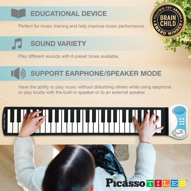 - 6 DEMO SONGS & 8 UNIQUE TONES - Portable roll up piano improve kid's hand-eye coordination at an early age. Children can enjoy playing the piano with their hands to create fun and exciting music. 6 different demo songs for you to enjoy while learning how to play. Fun and entertaining, perfect educational present for school-age children. Promotes kids' creativity by creating music with multiple tones. Choose from eight different tones to add variation to your music