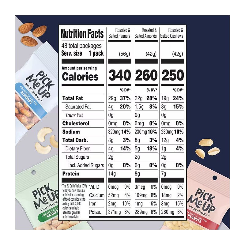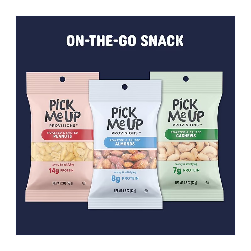 Pick Me Up Provisions Roasted & Salted Almonds Cashews Peanuts Variety Nuts Single serve 48 Bags/Box