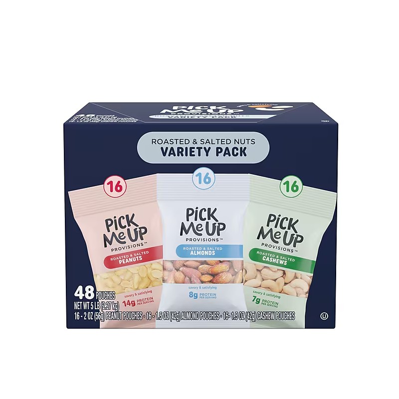 Enjoy a savory and satisfying snack with Pick Me Up Provisions™ variety pack. This 48-count box includes individually wrapped single serve bags of roasted and salted peanuts, almonds, and cashews, perfect for on-the-go snacking. These kosher nuts are carefully roasted and seasoned to perfection, providing a delicious and convenient snack option. With a mix of your favorite nuts, this variety pack is ideal for any occasion.