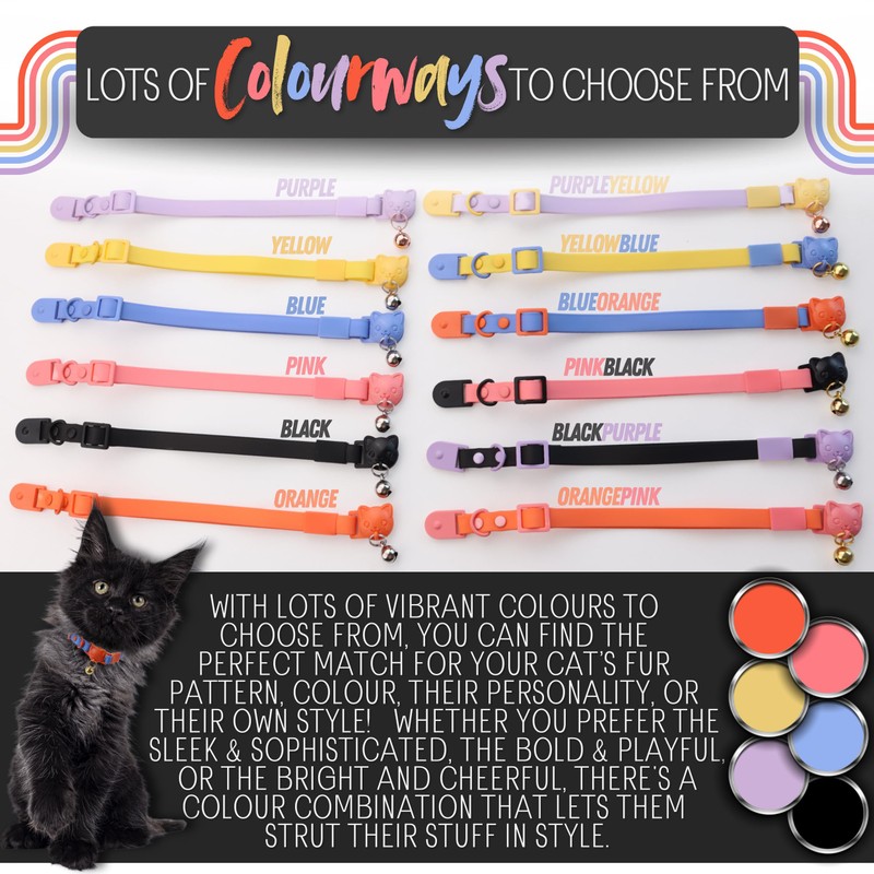 - 🎨 Lots of Spectacular Colour Combinations – Choose from solid Black, Purple, Blue, Yellow, Orange, Pink or our multicolour collars to match your cat’s fur, personality, or sense of style!