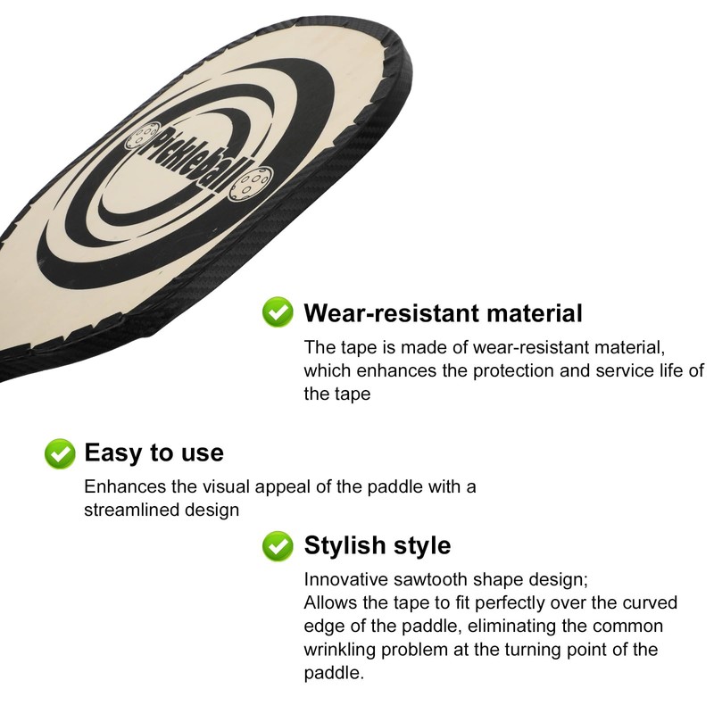 - RELIABLE DESIGN Our pickleball edge tape with a unique serrated design fits seamlessly around the edges of your paddle, ensuring a smooth and wrinkle free application.