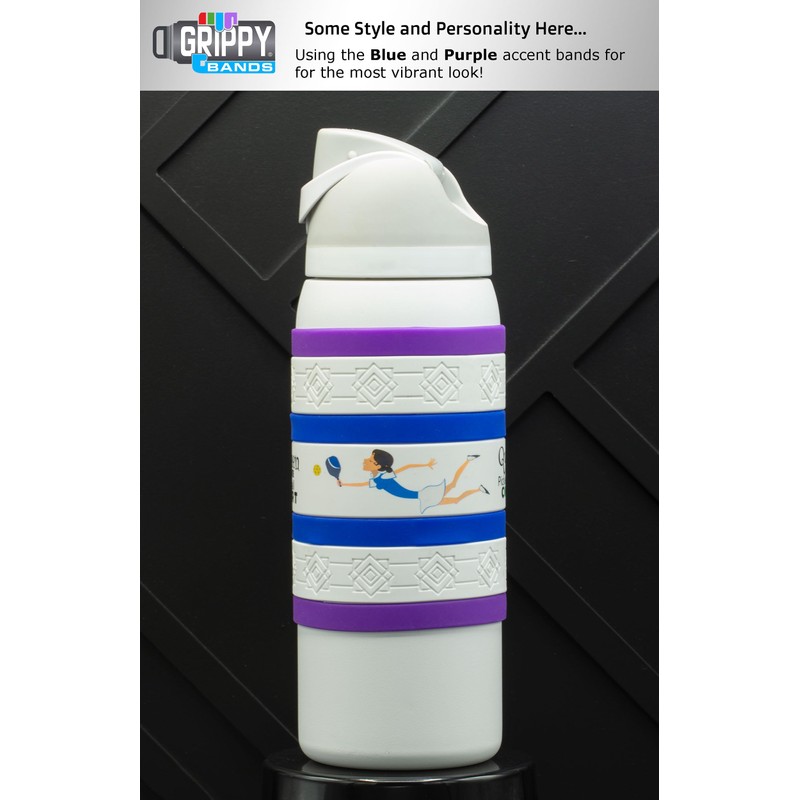 Grippy-Band bottle grips are a stylish new way to protect your stainless steel water bottles. They provide a secure comfortable grip. Each bottle grip kit contains a variety of colored silicone bands to achieve a stylish theme. You'll give your precious water bottle a great new look that will make it stand out from all others, while preventing dings, dents, and scratches.