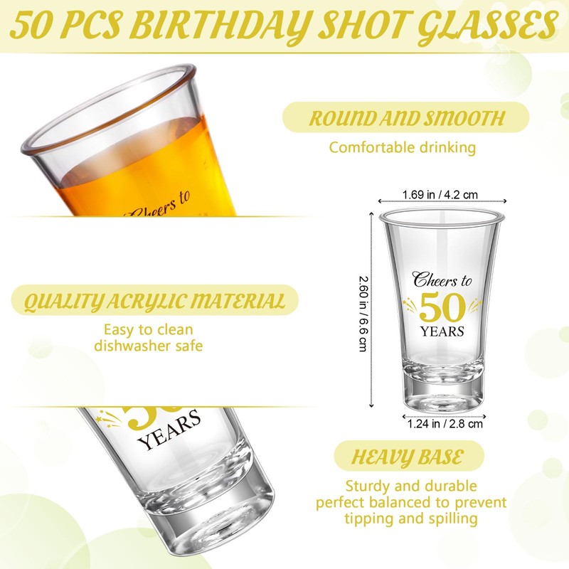 - Exceptional Quality: our 50th birthday shot cups are made from acrylic, providing a sophisticated but fun look to your party, and have the capacity of about 35ml; The cards, designed in black, gold, are made from coated paper for a lustrous finish; The organza bags come in a delicate and classy touch to your gifts