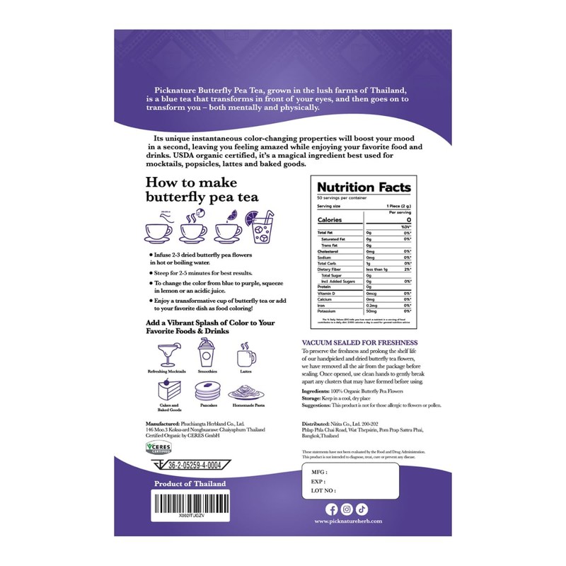 - Premium Organic Tea - Picknature Butterfly Pea Flower tea is organic by CERES Laboratory and sustainably sourced from our partnered organic farmers in Thailand. Our product is made with only Non-GMO herbal flowers straight to the bag and nothing else!