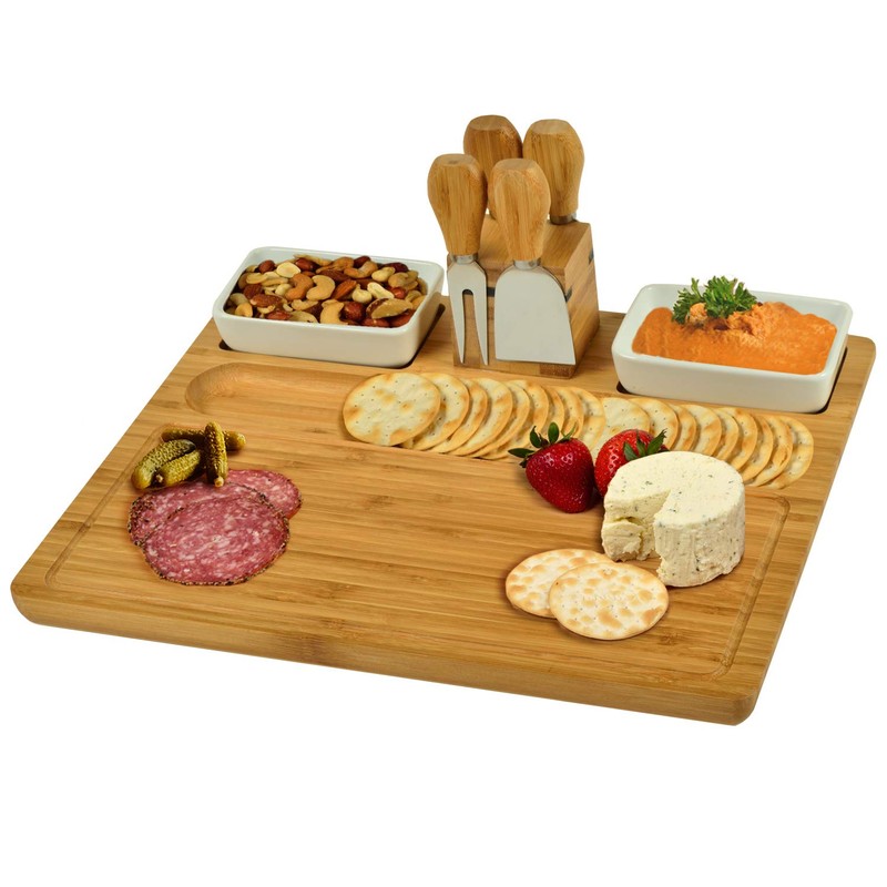 - ORGANICALLY GROWN Bamboo/Charcuterie Serving Platter includes 2 Ceramic Bowls & 4 Stainless Steel Cheese Knives.