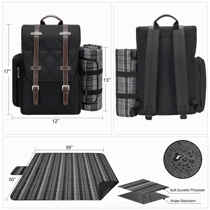- **Patented **Large Capacity Picnic Backpack with Insulated Cooler Compartment – sized 17"x 11.5” x 5.5"insulated food compartment can easily fit 4 people food and drink and keep hot/cold/fresh for hours, padded with thick foam, and with leak-proof pouch, it's easy to clean after use.