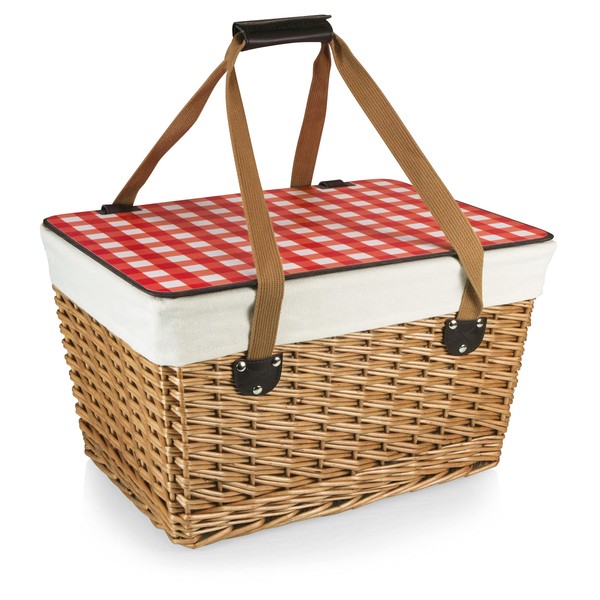 PICNIC TIME Canasta Grande Wicker Picnic Basket, Classic Large Wicker Basket for 2 with Handwoven Willow Design, Removable and Customizable Lid, (Beige Canvas with Red & White Gingham Pattern Lid)