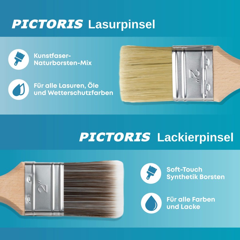 - Versatile - The flat brushes from PICTORIS are ideal for all solvent-based and water-based paints. This includes acrylic paint, wood varnish, coloured varnish and various protective varnishes. The high-quality soft-touch synthetic bristles guarantee optimal absorption, storage and release of the respective paint medium.