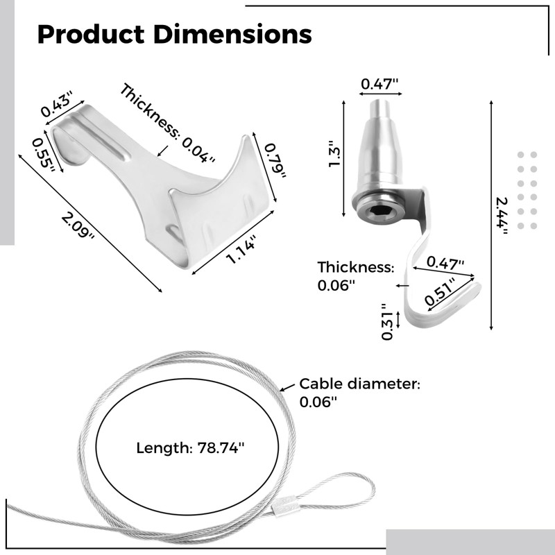 • 【Adjustable Hanging Height】 Customize your display effortlessly! Each picture hanging cable is 79'' long and comes with an adjustable hook. Simply press the top button at the hook, and you can slide it down to your desired hanging height.