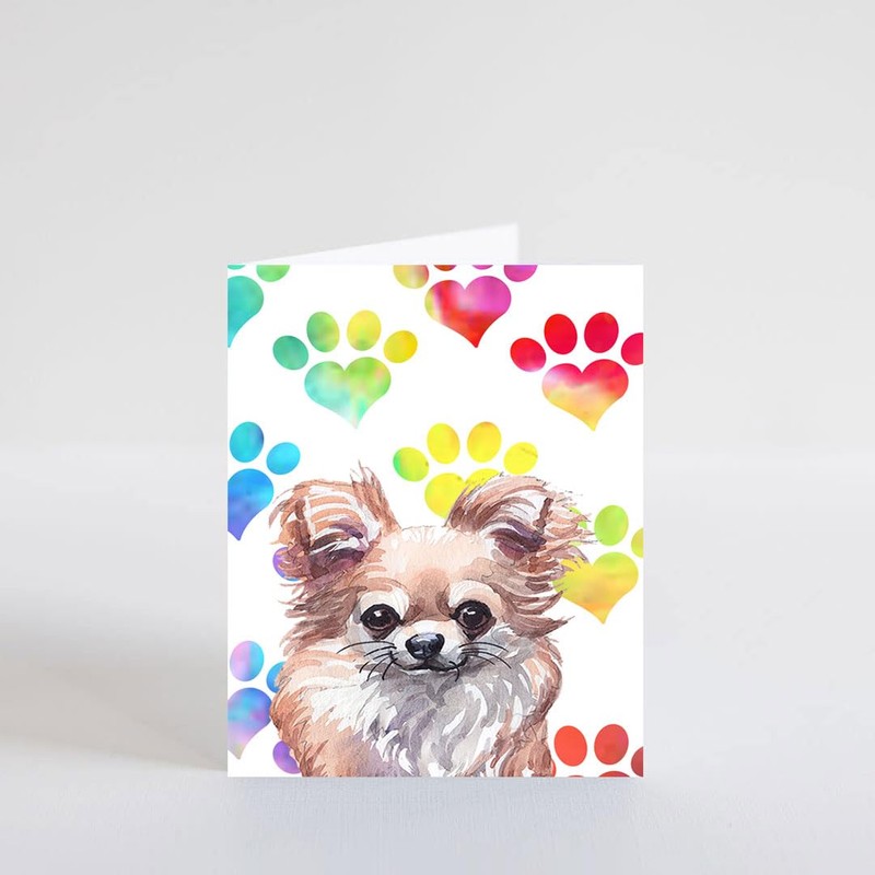 - Charming Chihuahua Greeting Card: This 5x7” card features a beautifully printed Chihuahua with vivid rainbow paw prints. It’s a heartfelt design that dog lovers will adore, whether for birthdays or simple notes.