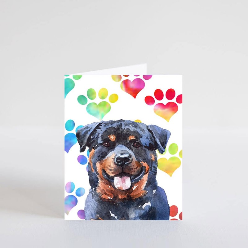 - Charming Rottweiler Greeting Card: This 5x7” card features a beautifully printed Rottweiler with vivid rainbow paw prints. It’s a heartfelt design that dog lovers will adore, whether for birthdays or simple notes.