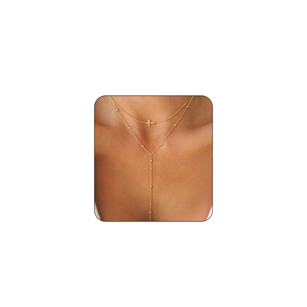 Picuzzy Lariat Gold Layered Necklace, Dainty 14K Gold Plated Long Chain Necklaces for Women Trendy Non Tarnish Gold Cross Pendant Y Shaped Necklaces Waterproof Gold Jewelry for Women Valentines Gifts