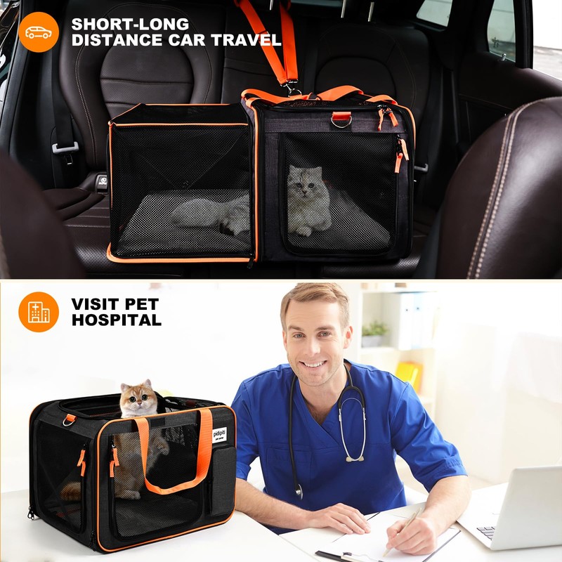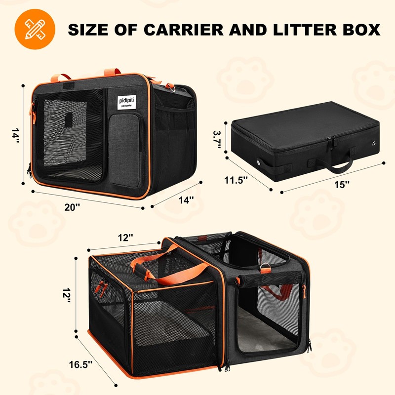 - 【Expand to provide more space in car travel】 Size of carrier is 20(L) x 14(W) x 14(H) inches, size of expandable part is 16.5 x 12 x 12 inches ),the expandable part can provide a extra space as an activity/play zone for pet,you can put a small portable cat litter box in expandable part and let pet stay in body of carrier.