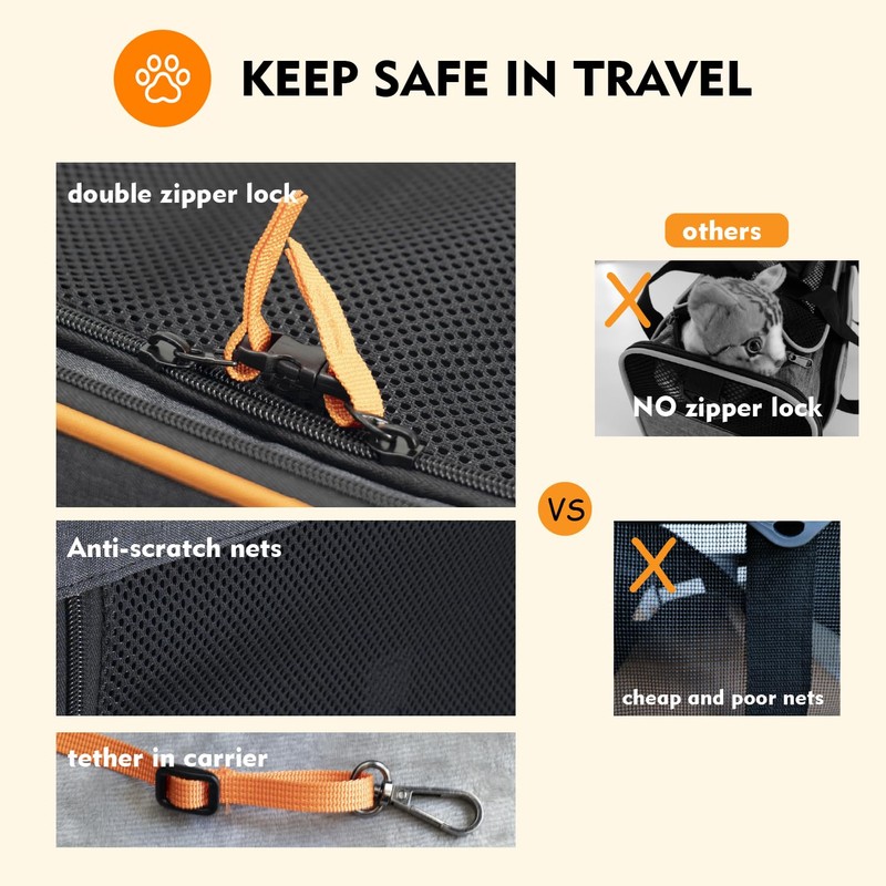 - 【keep safe and stable in travel】 All loading ports have a double zipper lock to prevent pet opening zippers and escaping.all breathing meshes are anti-scratched,an adjustable tether in carrier can be connected to a pet harness.shoulder strap and a extra safety-srtrap can be used as seat belt when it is connected to the headrest of seat. 2 metal frame are implanted into body of carrier to keep carrier stable and make sure no collapse on pets.A hard wooden board support the bottom.D-shaped buckle on carrier and hooks on shoulder strap are made of metal material instead of plastics.