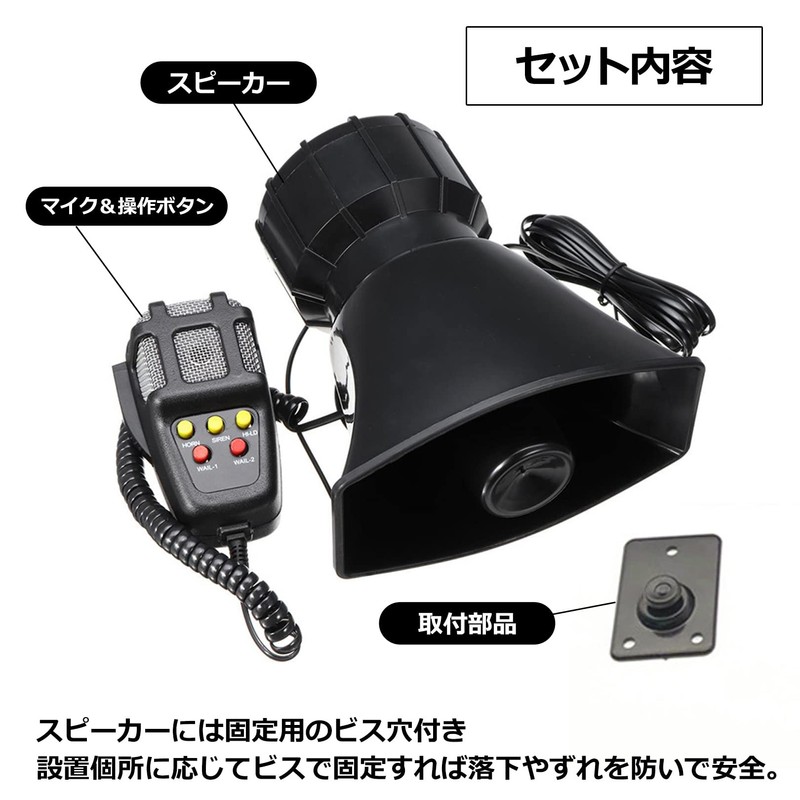 - This in-car loudspeaker has 5 different types of sounds, 7 different siren sounds and a large microphone with built-in amplifier. 100W max output, 12V loud 300dB Handheld microphone for siren, voice adjustment. Election Patrol, Outdoor, Marine, Recovery and more