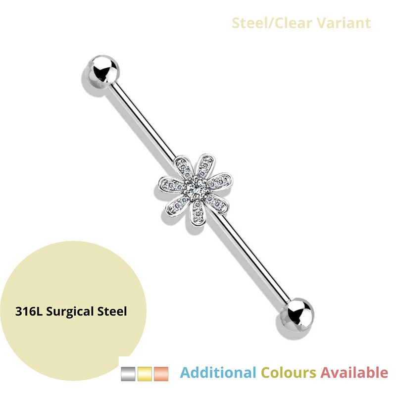 PiercedOff 316L Surgical Steel Externally Threaded Clear CZ Paved Flower Industrial Barbells - Thickness 14GA (1.6mm) / Length 38mm / Ball Size 5mm